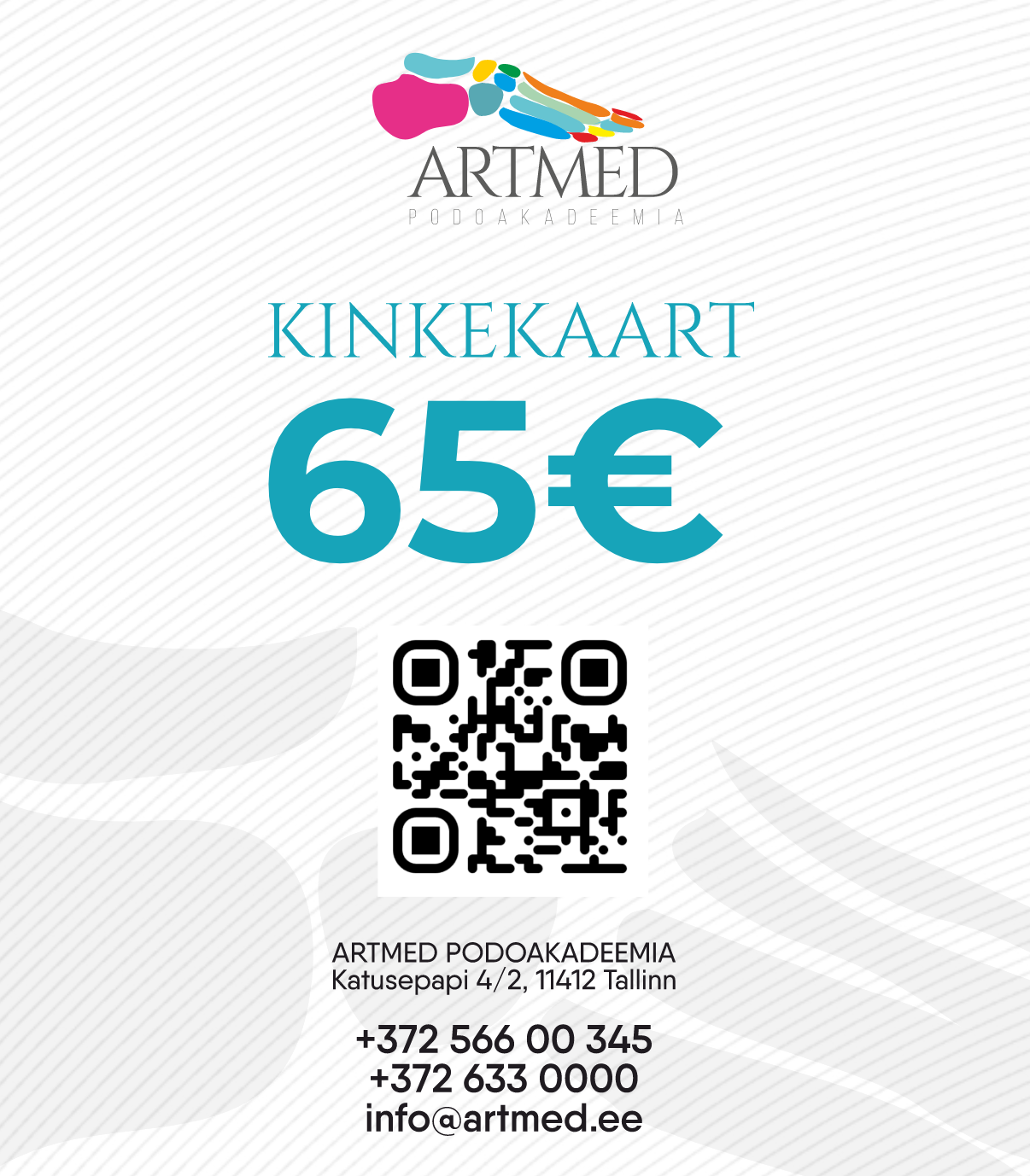 Подарочная карта центра ArtMed Podoakadeemia — это отличный выбор для тех, кто ценит профессиональный и бережный уход за ногами. С её помощью можно оплатить услуги центра, а также приобрести средства по уходу на стойке администратора.